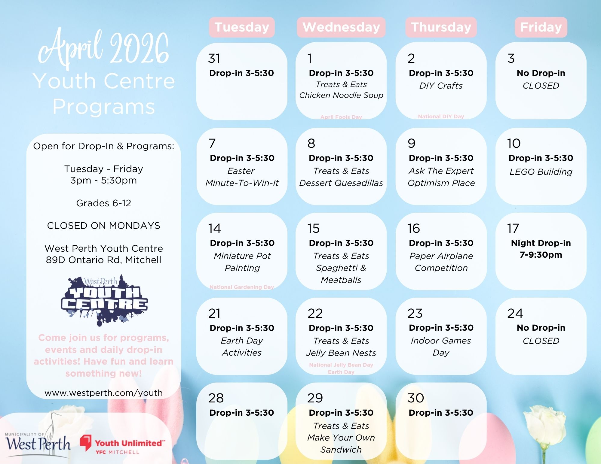 Staff, volunteers, and community partners work together to create a positive environment where youth feel valued, supported, and proud to call West Perth home. Volunteer support is provided by Youth Unlimited YFC Mitchell.
