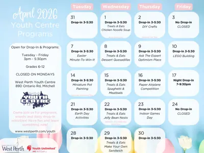 The West Perth Youth Centre is a safe, welcoming space where youth can connect, learn, and have fun. Open to students in Grades 6–12, we offer free drop-in programs, activities, and special events designed to help youth build friendships, develop new skills, and feel part of the community. From games and crafts to workshops, leadership opportunities, and themed events, the Youth Centre encourages youth to try new things, express themselves, and get involved in West Perth.