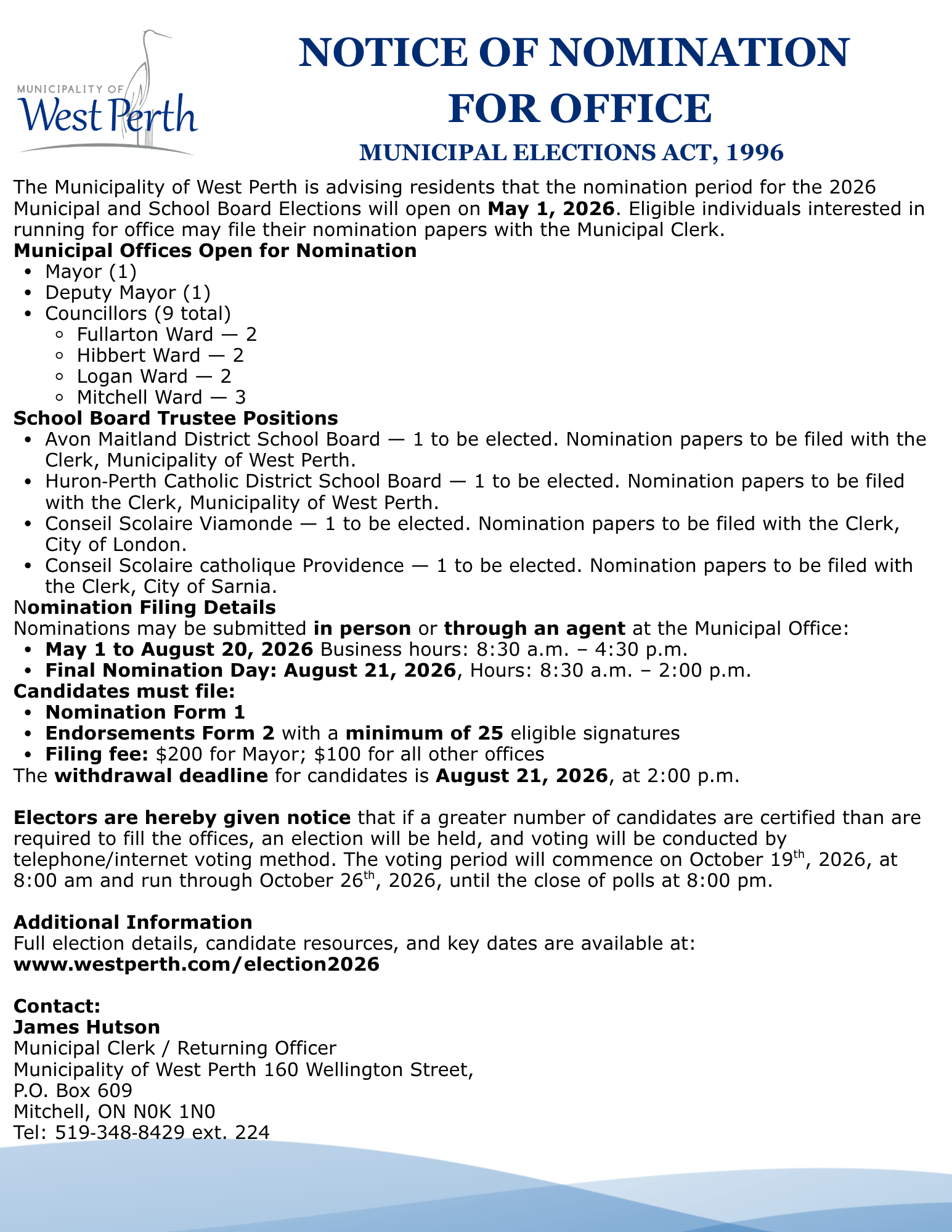 Nomination Day: Friday, August 21, 2026, 9:00 a.m. – 2:00 p.m.